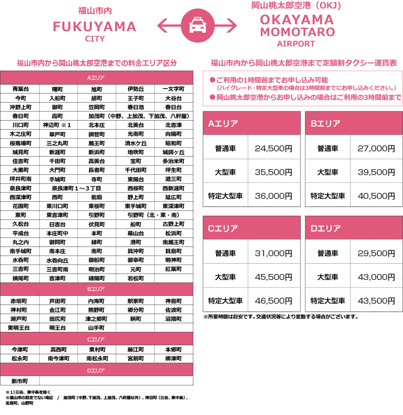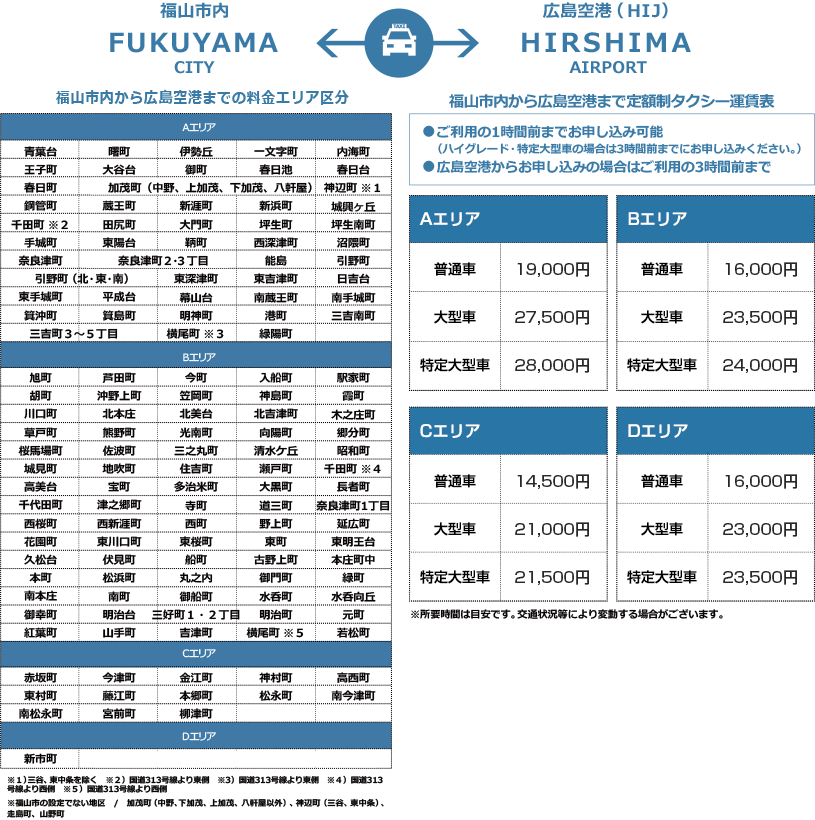 福山市内と広島空港・岡山空港間を定額で送迎するタクシーです。